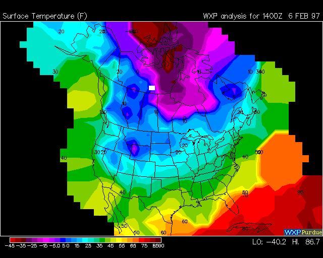 In our last Challenge Question we also asked how cold it was for Caribou # 6977 on February 6th. According to this temperature map which was downloaded from the Purdue University Weather Processor, it appears to have been a balmy 0 F on that day at 7 am local time. (The time "1400 Z" printed on the map stands for 14:00 o'clock "Zulu". This refers to the time in Greenwich, England. Since the caribou are 7 time zones to the west of Greenwich, it was 7 hours earlier, or 7 am.) Although they were far away, Ms. Talbert's students in California came the closest with their guess of -3F. Here's what they did: "First we figured out where the caribou was by using the longitude and latitude on a map. When we found where he was, we used the newspaper to find out his temperature. We found that he is at -3 F." (ltalbert@mail.mcn.org) Chris Gowan and Andrew Baumann, Ms McGinley's students in Maryville, Tennessee came close also with an estimate of -10 F. "We found this information that was on a Web Site on Netscape Navigator on a weather map of Canada. The 6 caribou must be traveling close together and are experiencing the same weather conditions." (MCGINLEYL@ci.maryville.tn.us)