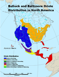 The gold shows the Baltimore oriole's breeding range. (The red shows