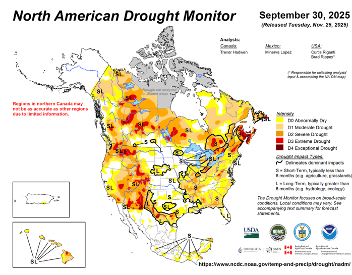 The July 2025 map below shows good conditions throughout most of the eastern North American monarch breeding range. While there was more drought in late September, the main part of the central flyway wasn’t too bad. Southern Texas was dry, but again, if monarchs made it through Texas, they faced good conditions in northern Mexico. Additionally, the wetter conditions throughout much of Texas in the summer meant that wet conditions still existed along rivers and low areas, providing important sources of the nectar needed to fuel the migratory flight.