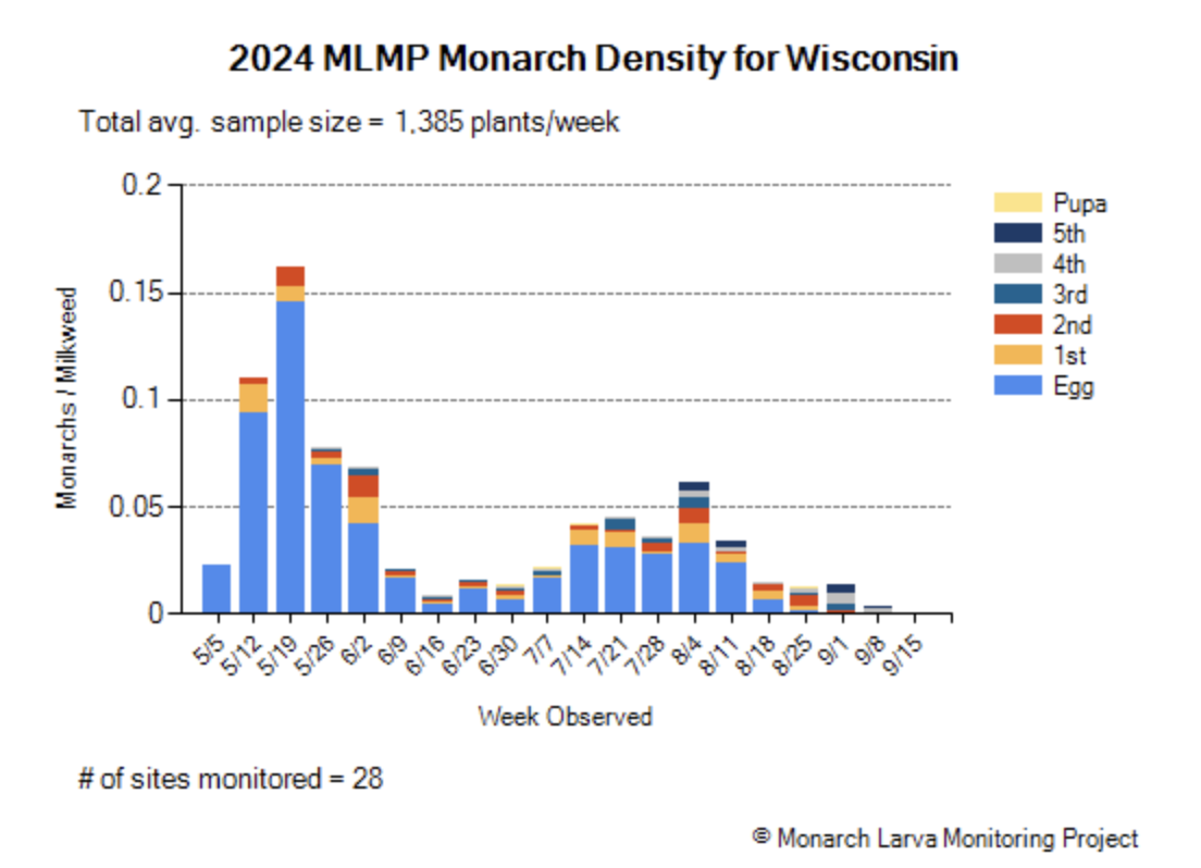 Conditions in 2025 were better. In contrast to 2024, Monarch Larva Monitoring Project volunteers documented a strong increase in monarch densities in the second and third generations (see Wisconsin graph below).