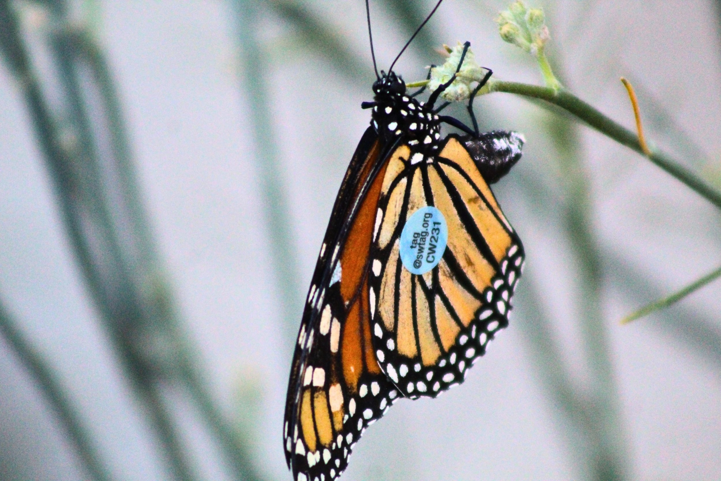 In Arizona, Christina in Mesa reported a tagged monarch in her yard nectaring. “Female, observed flying around and resting on a Desert Rush Milkweed plant in my garden. Slight damage to left forewing tip.” This monarch was tagged a few days earlier in nearby Apache Junction.
