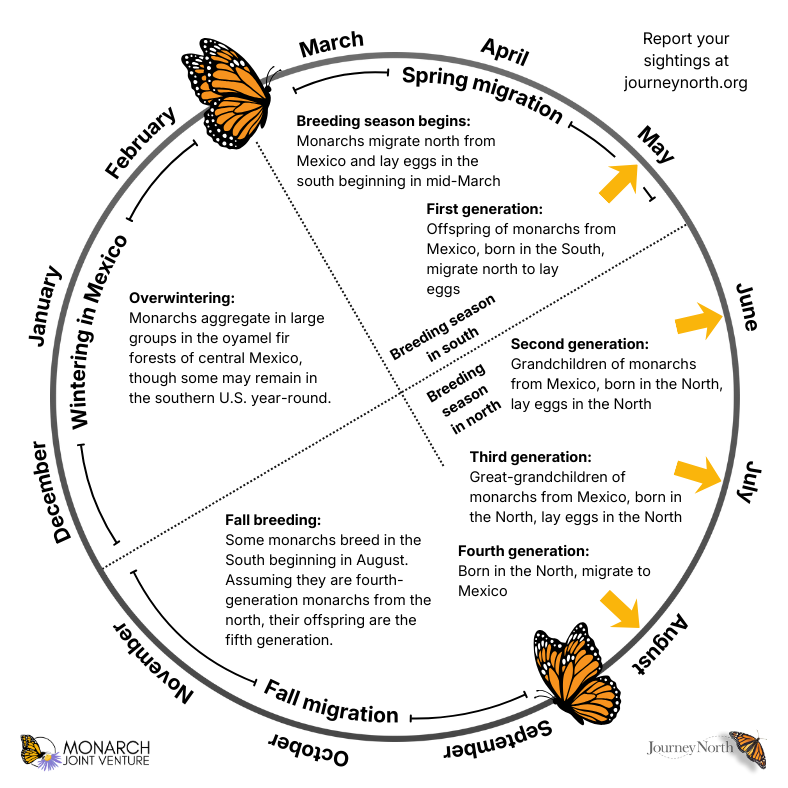The monarch migration north is a multi-generational journey that begins in Mexico. The monarchs that spent the winter in Mexico will make it to the southern U.S. before laying eggs. Their offspring will move further north before laying eggs in the north.
