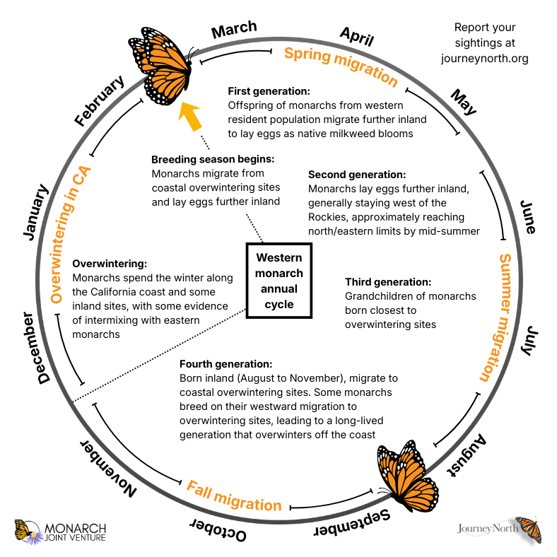Monarchs west of the Rocky Mountains also migrate, but their annual cycle is slightly different than those east of the Rockies.
