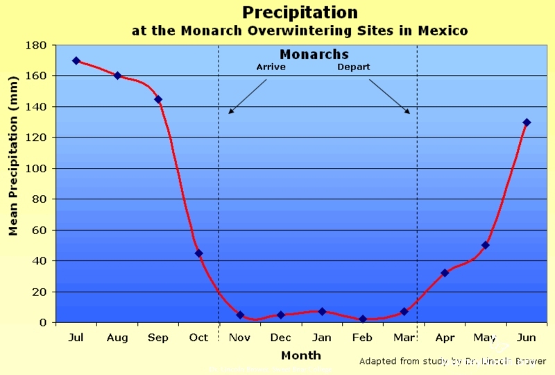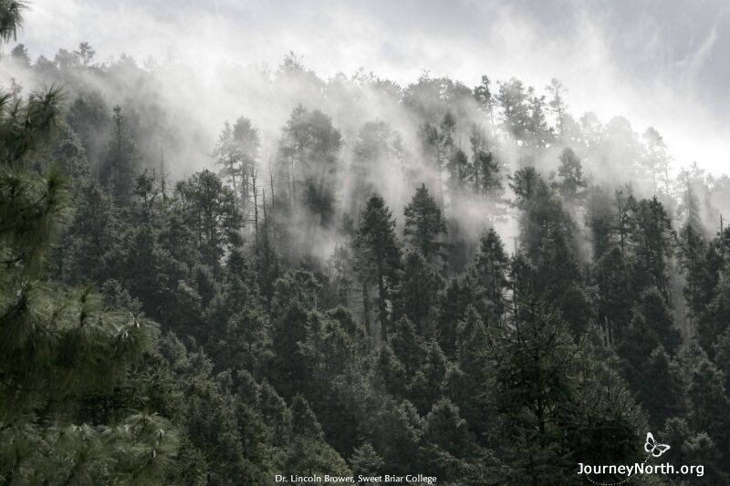 Moisture is crucial for monarchs' overwintering success in Mexico. The late Dr. Lincoln Brower hypothesized that one of the reasons monarchs overwinter where they do is because the high-altitude mountains of the Monarch Butterfly Biosphere Reserve capture moisture.