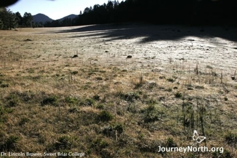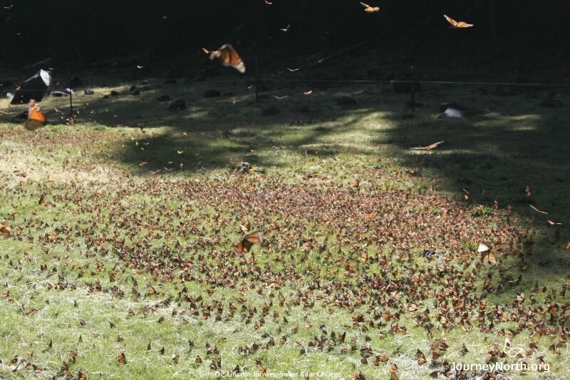 On the morning of Dec. 11, 2006, Brower took the photo below, which shows condensed mist frozen on the open area of Cerro Pelon, known as the Llanos de los Tres Goberonores. In the second image, you can see monarchs -- Brower estimated there were several thousand -- drinking dew after the sun's rays warmed the frosted ground and melted the frost into dew.