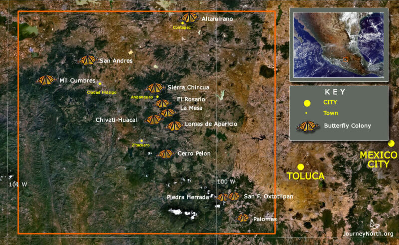 From across the eastern U.S. and southern Canada, monarchs funnel toward Mexico, where they take refuge in oyamel fir trees on south-southwest-facing mountain slopes. These locations provide cool temperatures, water, and adequate shelter to protect them from predators and allow them to conserve enough energy to survive winter.