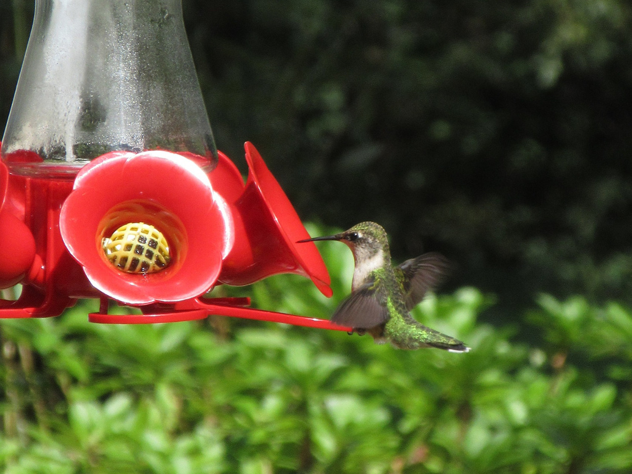 Ruby throated hummingbird at feeder