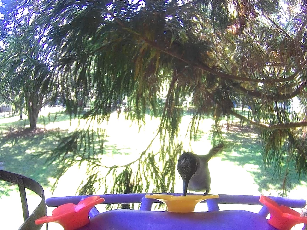 Female feeding a lot from trumpet vine and crape Myrtle and feeders