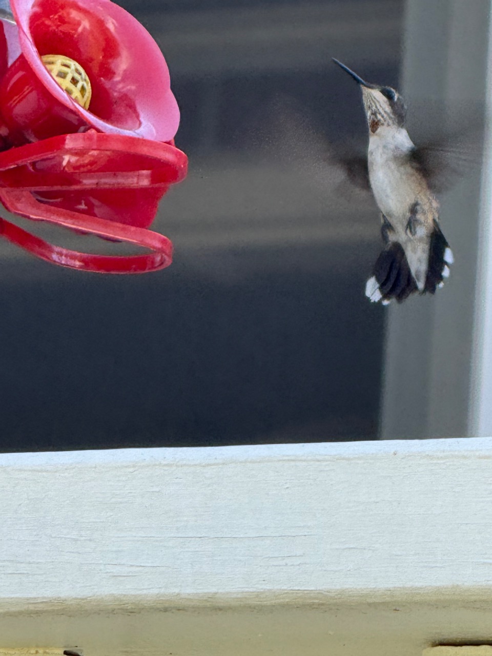 Female ruby throated hummingbird sighted at my backyard feeder. Three females and one male have been regular visitors the past three weeks.