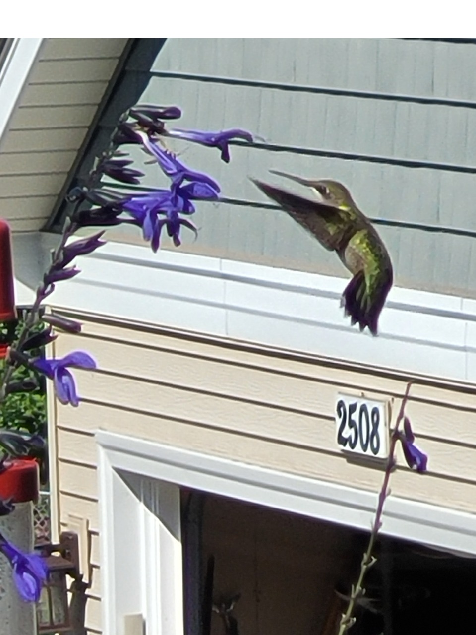 We have a new female adult ruby-throated hummingbird on the block. She seems to have just shown up today and knows what a nectar feeder is. The other 2 seem not to. Lots of feeding again at black-and-blue salvias and cigar flowers along with insects. The newly arrived RTHB fed several times this evening at a couple nectar feeders. Evening feeding cutoff remained the same as yesterday, 7:13 p.m. cdt.