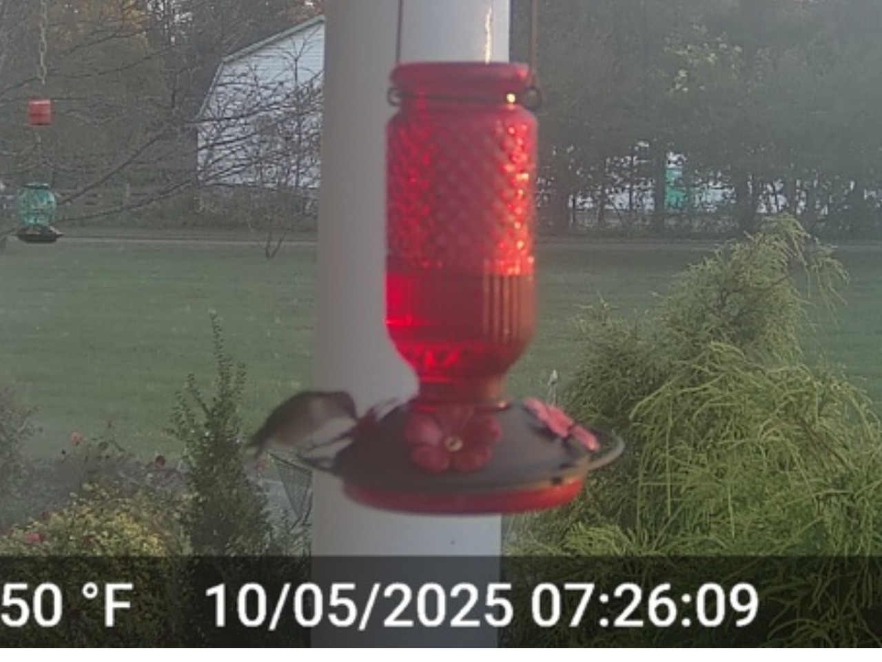 Photo of one hummer visiting one of our 3 porch feeders this morning. Have trail camera positioned by feeder. Also have multiple visits to the two feeders on the patio, at least two hummers contesting one feeder there. Security cameras positioned to view each of these feeders have captured hummers at 3 to 16 minute intervals since 6:45 am and are continuing as of 9 am. Yesterday saw few hummers between 10am and 4 pm.