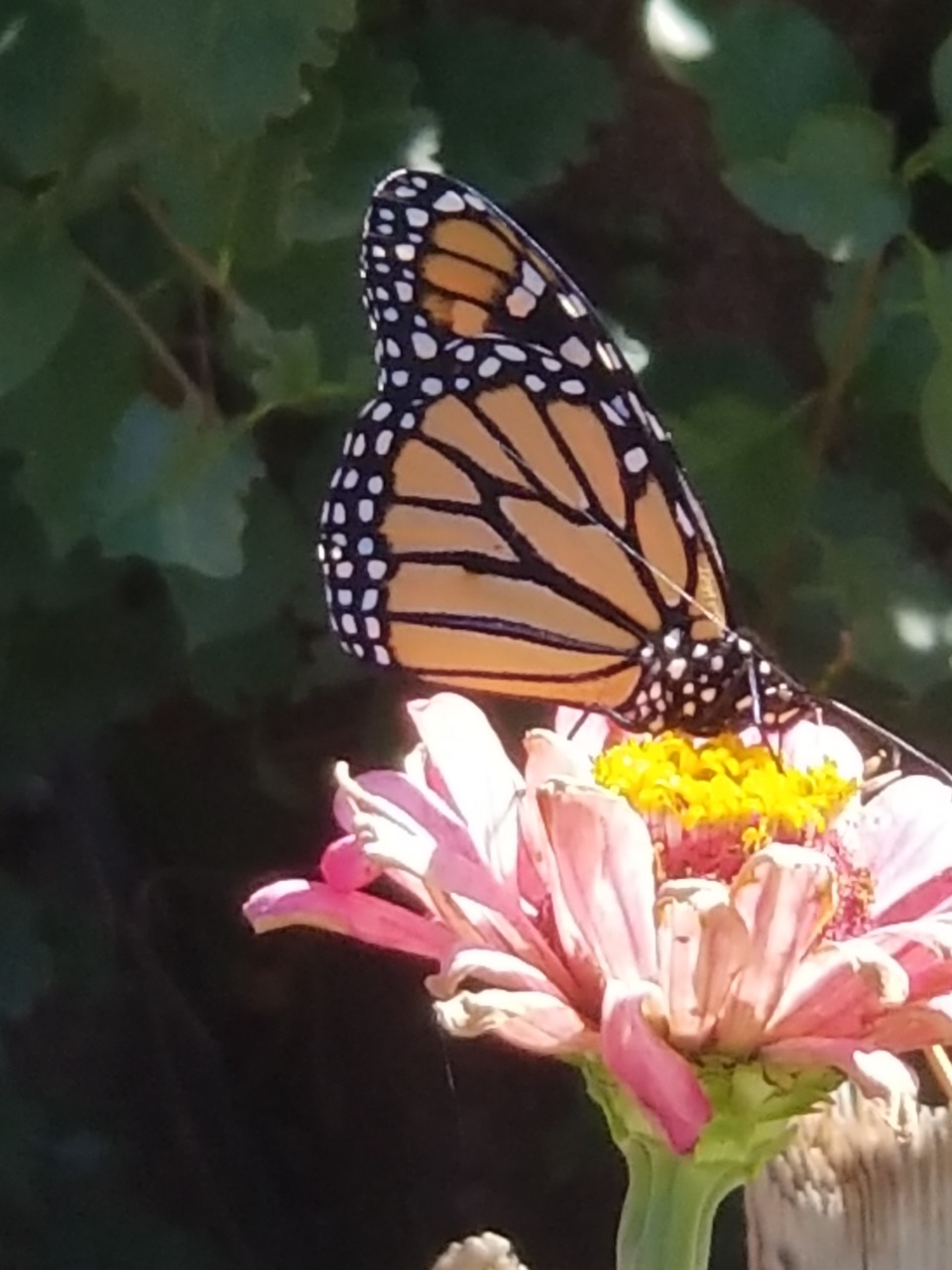 Spotted 2 Monarchs nectaring on the last blooms of the Cosmos and Zinnias.